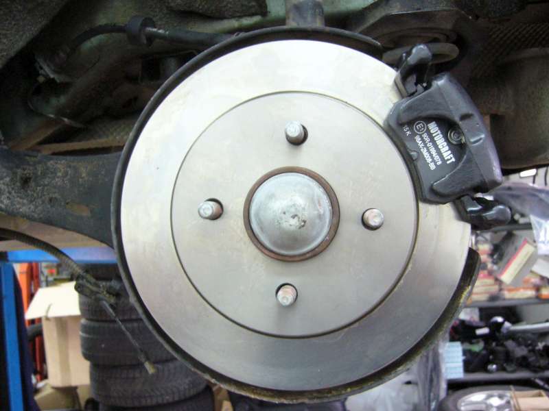 Náboj pro kotoučovou brzdu s čidlem ABS Vezmeme náboj pro kotoučovou brzdu, plus příslušný krycí plech kotouče (pozor je levý a pravý!!!) a přišroubujeme jej 4 šrouby na rameno místo bývalých bubnů. Přišroubujeme zpět tlumič!(v pozadí Foki při výměně) Na náboj nasadíme kotouč. Ten musíme předem odmastit, a v místě kontaktu s nábojem jej namázneme měděnou vazelínou. Nasadíme část brzdiče v níž jsou nasunuty brzdové destičky edit: zkontrolujeme , zda stefty volne "plavou" pokud jsou zatuhle dojde ke sjizdeni desticek a nepravidelnemu opotrebeni kotoucu Nasadíme brzdové destičky
