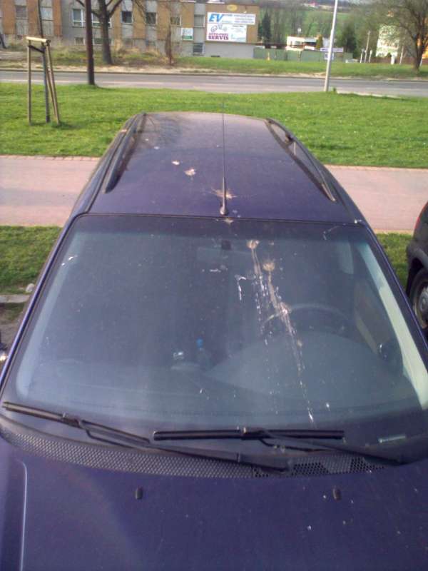 Hoši tohle nic není. Loni na dovolené mi něco posralo auto tak, že jsem to drhnul půl hodiny, na dveřích jsem měl asi 30cm kruh bílo hnědého hovna, nějak mi nejde do hlavy, jak mohlo vůbec vzlétnout něco co mělo tohle v sobě