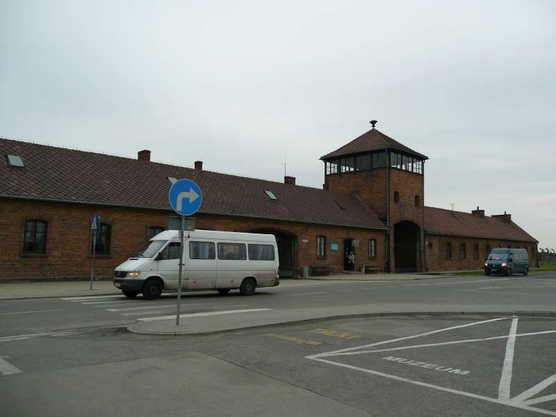 Po prohlídce která nám trvala 2 hod. a to jsme prošli tak 50% tábora a bez průvodce, jsme se přesunuli do tábora Auschwitz. Vzdálenost je autem 2 min. jízdy. A jsme u zmiňovaných naháněčů. Budou Vám skákat v reflexních vestách pod kola a ukazovat, kde máte parkovat. Samozřejmě se jedná o placené parkoviště. Né že bych neměl na parkovné, ale proč parkovat dál od hlavní brány a ještě za peníze, když to můžu mít zadarmo a přímo u vchodu. Já to samozřejmě přejel, ale nic se neděje. Na každé následující křižovatce se dejte vlevo a dojedete k druhému neplacenému parkovišti ze kterého se projde 100m spojovací cestou k hl.bráně.