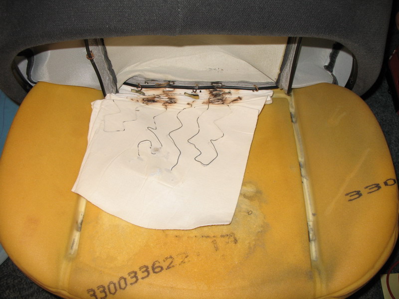 Po vyndání sedačky a kontrole přívodních vodičů mi nezbývalo než sundat potah a dostat se přímo k dečce. Místo, kde je spoj napájecích vodičů a odporového drátu (a zdroj většiny problémů), je bez sundání potahu nepřístupné. Na druhou stranu, potah jde dolů celkem snadno po uvolnění výztuhy po obvodu ze spodní strany sedačky, pak je ale nutné postupně buď cvaknout nebo odehnout několik drátových oček držící potah v několika místech shora sedačky. Já jsem volil cvaknutí a pak náhradu stahovacími pásky.