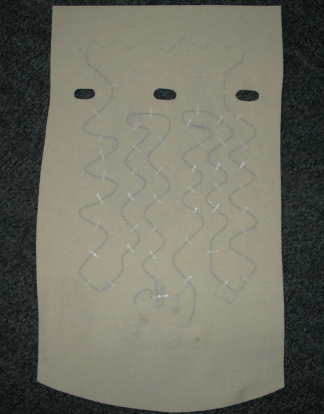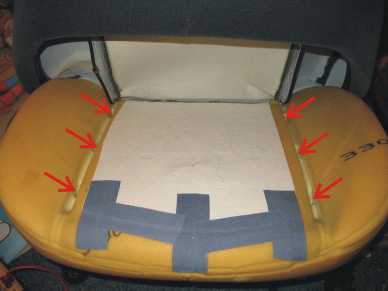 V zoufalství jsem použil snad vše co mě napadlo, abych zabránil posunu dečky na sedáku. Použil jsem oboustranou pásku, místy i kobercovku a v několika místech přišil k drátu tam, kde je potah přitažen očkama (viz šipky). Uvidím, kolik toho sedák vydrží teď. (chybí mi finální fotka po všech těch fixačních procedurách) Závěrem trocha ohmů a wattů - hodnota odporu jedné části je cca 1.6ohm (1.6ohm sedák + 1.6ohm opěradlo), tedy při běžícím motoru připadá výkon na sedák + opěradlo asi 60W. Připojení pouze jednoho okruhu (byť jen dočasně) nepřipadá v úvahu, nehledě na to, že čidlo je jen v sedáku.
