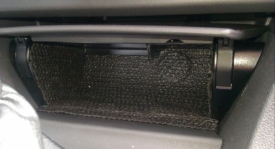Zpátky to půjde patrně OK. Zepředu se nacvakne do díry v kastlíku zelená část s připojenou žárovičkou a do ní se prostě zatlačí správně orientovaný kovový kus a bude to. Pro jistotu oddělám i ten plast u nohou spolujezdce. Je potřeba to zatlačit dost silou, tak si to raději přidržím zezadu. Navíc budu moct ve finále zkontrolovat připojení elektriky. Dnes nebo zítra na to jdu. Pak přijde úprava plastové vložky s dvířky...