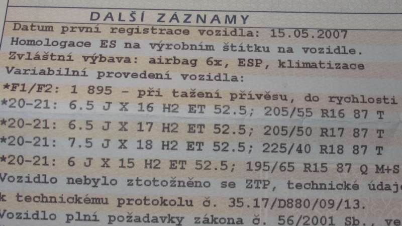 V čistopisu TP je mimo jiné uvedeno 6J x 15 H2 ET 52,5; 195/65 R15 87 Q M+S - je to jediná uvedená varianta pro zimní pneu M+S. Auto má nyní orig. 16" ALU a nové celoroční GoodYear Vector 4Season 205/55 r16 M+S. (FoFo II 07, 1.6-74kW - dovoz z Německa). Může nastat problém při kontrole, resp. pokud budu chtít měnit za čistě zimní, musím použít 15" na místo 16"? Dík za odpověď