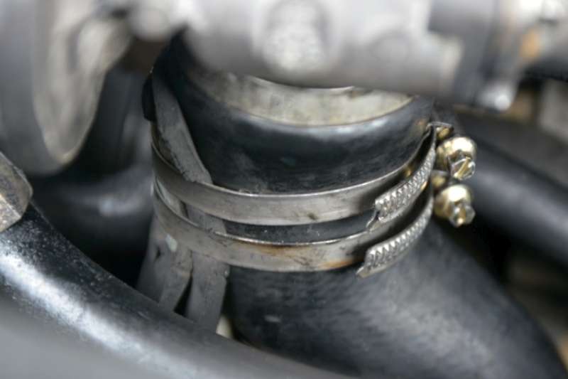 Také mi teď hadice praskla. Do doby sehnání originální jsem ji opravil. Dvě vrstvy měkké gumy ze staré podložky pod myš, překrytí natvarovaným plechem a stáhnutí dvěmi hadicovými sponkami.
