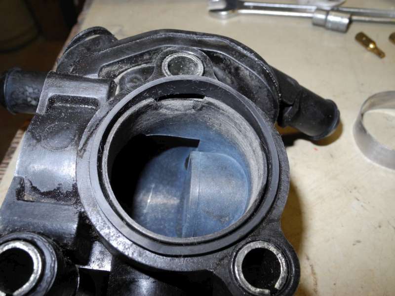 Po rozebrání jsem zjistil příčinu (velmi typická) - plastové mezikruží, které tvoří vnitřek drážky pro těsnící o-kroužek (těsní na blok motoru) je velmi slabé a časem plast zkřehne, kousek se vyštípne, gumový o-kroužek ztratí oporu, prohne se dovnitř a přestane těsnit: Protože jsem nechtěl cpát Fordu prachy za diletantsky navrženou věc, která je navíc z degradujícího plastu (viz obtoková trubka nad chladičem, která se začne časem rozpadat a další plastové díly v chladící soustavě), navíc jsem potřeboval druhý den mít auto pojízdné, zvolil jsem opravu: