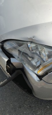 Přední levé světlo je KO, kapota dostala taky trošku, přední narázník je KO a dále nevím. Kvůli přednímu blatníku, který se nárazem posunul trošku dozadu se blbě otevírají a zavírají přední dveře u řidiče a zadní jsou na tom ještě hůř. Dveře od kufru KO, zadní nárazník KO a taky levý zadní blatník je KO a myslím, že se určitě nějakým způsobem hnulo i levé zadní kolo, protože je blíže blatníku než to kolo napravo, které je asi v pořádku.