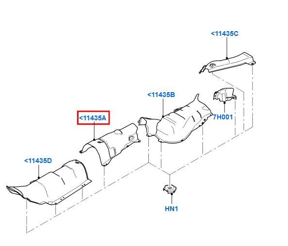 mám podobný problém, ale u mého auta (rv 2009, 1,6tdci, VIN WF0SXXGCDS9P13243) ten pátý díl podle schématu nemá být: Ale ve skutečnosti tam mimo dílů 11435A-D je ještě jeden menší kousek (mezi B-C) který kryje nádrž s aditivem. Je (byl) uchycený na zadní nápravě. Na dílech B a C jsou vyžrané díry v místech uchycení, dám tam větší podložky, ale ten menší kousek je v nepoužitelném stavu, je roztržený na tři díly.