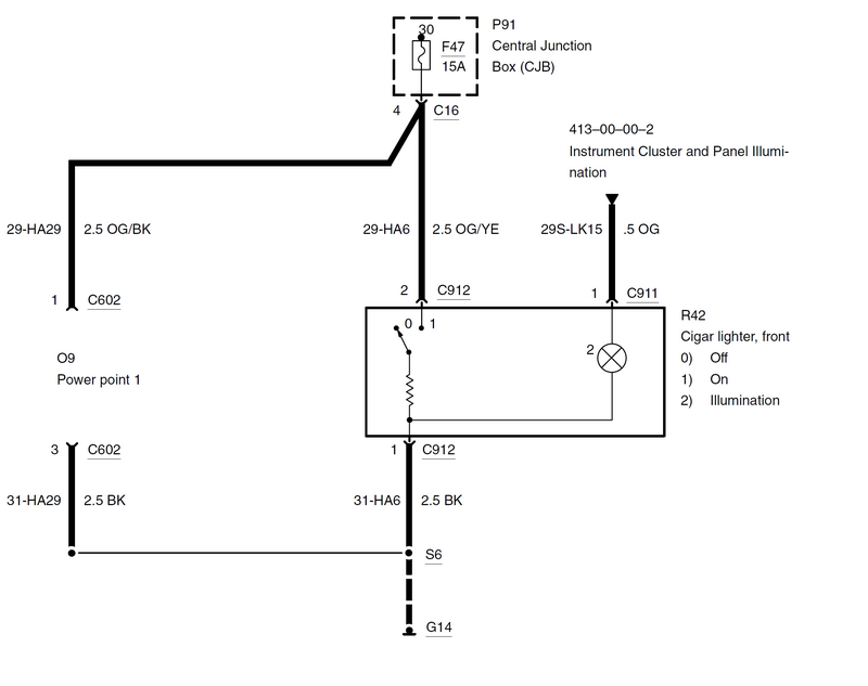 Viz schema. Zapalovac je na pojistce F47, ktera je primo napajena z motorove pojistkovky. Pokud ale zasuvka vzadu na stredovem tunelu funguje a predni ne, musi byt problem na prednim zapalovaci. bud je nektery z vodicu poskozeny, neni pripojeny konektor zapalovace, nebo jsou opalene vnitrni kontakty zasuvky zapalovace.