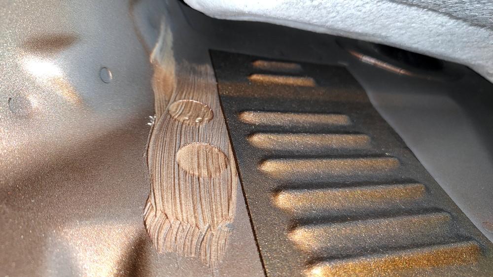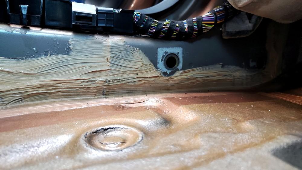 Dnes jsem si udělal fotku napřed od spolujezdce, abych vyloučil, že to tam kápne po otevření dveří... Přijde mi to jako kapky z vrchní části rámu dveří, nebo to jde někde kolem těsnění, což moc nechápu. Utřu to po zavření zevnitř a budu sledovat, jestli tam zase budou nebo ne.