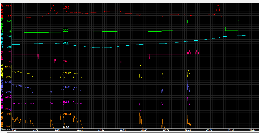 Podla live dat senzor teploty vyfuku skoci z cca 180-200°C na 800°C. O par sekund zas spadne. Potom vyleti zas. Ak v tomto momente auto zastane, zdochne motor a nejde nastartovat kvoli ulozenej P244D. Skok je samozrejme nerealny, je to niekde chyba pravdepodobne na kabelazi.