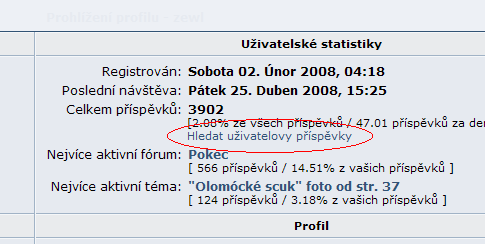 pak v Uživatelské statistiky kliknete na Hledat uživatelovy příspěvky