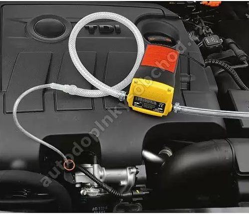 Hadička/trubička se strká měrkou na olej. Spousta lidí ti tady řekne že se olej vypouští přes výpušťák, že se vyplaví bordel ze dna vany. U jiných van kde vyteče všechen olej tak ano, ale u této vany je vypoušťák víc jak 1cm nad dnem, tak se nemůže bordel na dně vyplavit.