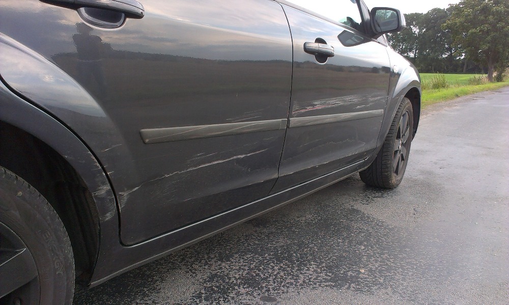 Jinak, už tady byl likvidátor a jen si k tomu postavil měřící hůlku, nafotil to, napsal 4 díly na opravu plus lak a dvě lišty a hototvo. Moc to neřešil, servisku nechtěl a ani lak neměřil.