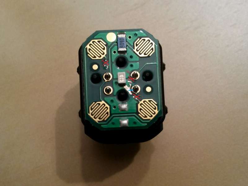 Originální zapojení tlačítka je tedy nevhodné a my chceme aby plnilo obě funkce. A jak na to? Tlačítko je zdvojené, jeden kontakt si půjčíme. Na tento přivedeme zem a propojíme na diodu. Kromě toho musíme na desce tlačítka ještě některé cesty přerušit...