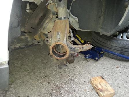 7- demontujeme matku z čepu spodního ramena pro otáčení kola a čep vypáčíme z těhlice, pak vykloníme těhlici směrem ven od motoru a vysuneme tisícihran poloosy. 8- teď použijeme přípravek pro demontáž ložiska, kdy se dvojitá objímka opře o těhlici, a šroub vytahuje ložisko za vnitřní kroužek ložiska. Mě to nešlo ani s dlouhou pákou, tak jsem předepnul šroub a pár ranami kladivem do šroubu stahováku jsem ložisko povolil. Pak už to šlo jako po másle. 9- vyčistíme těhlici od rzi pro montáž nového ložiska. 10- na nové ložisko dáme půlměsíce pro montáž ložiska za VNĚJŠÍ kroužek. 11- na nové ložisko a do těhlice naneseme pastu proti třecí korozi, já použil měděnou pastu.
