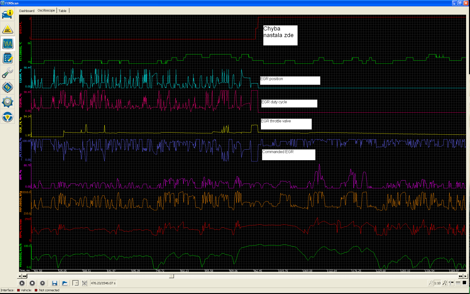 můj Ford C-Max 1.6 diesel duratorq 80 kW r.v. 2009 (stejny motor ma i Focus) najeto 180 tis mi hlásil P042F (chyba EGR ventilu). EGR ventil jsem vyměnil a nechal vyčistit i DPF filtr. Ale chyba se objevila zase, tak jsem EGR vyměnil ještě jednou, protože jsem myslel, že jsem koupil šunt. Ale chyba je tam zas. Polohy EGR jsem v diagnostice pokaždé vyresetoval. Momentálně chybu smažu, jedu 10 km a je tam zase (hned jak se zahřeje motor a EGR obvod začne něco dělat, tak naskočí). V příloze je obrázek z Forscanu. Je tam vidět, kdy naskočí chyba...úplně tomu nerozumím, ale zdá se, že se to snaží EGR naplno otevřít a dostane to asi zpátky něco jiného. Každopádně ten EGR je určitě OK a kabely k motorové jednotce nejspíš taky (jinak by to asi házelo víc chyb do těch průběhů). Máte někdo zkušenost, jak to má vypadat?