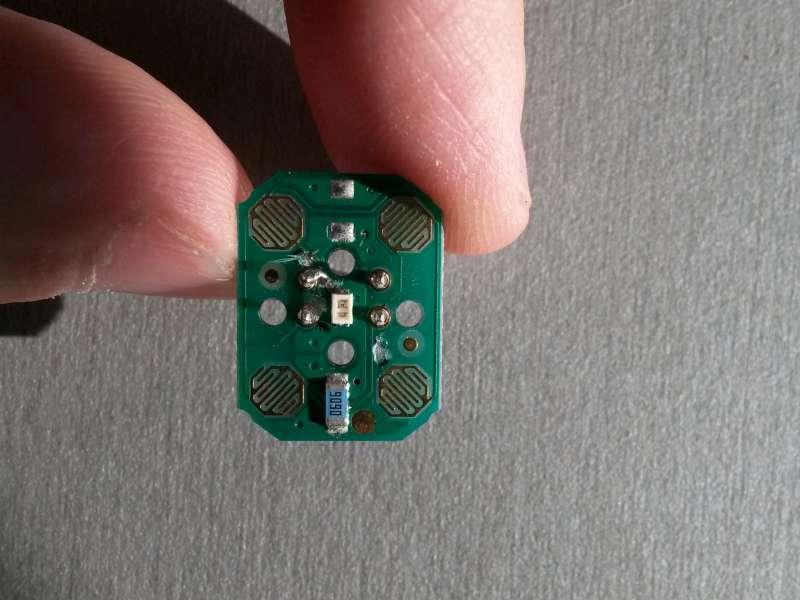 Originální zapojení tlačítka je tedy nevhodné a my chceme aby plnilo obě funkce. A jak na to? Tlačítko je zdvojené, jeden kontakt si půjčíme. Na tento přivedeme zem a propojíme na diodu. Kromě toho musíme na desce tlačítka ještě některé cesty přerušit...