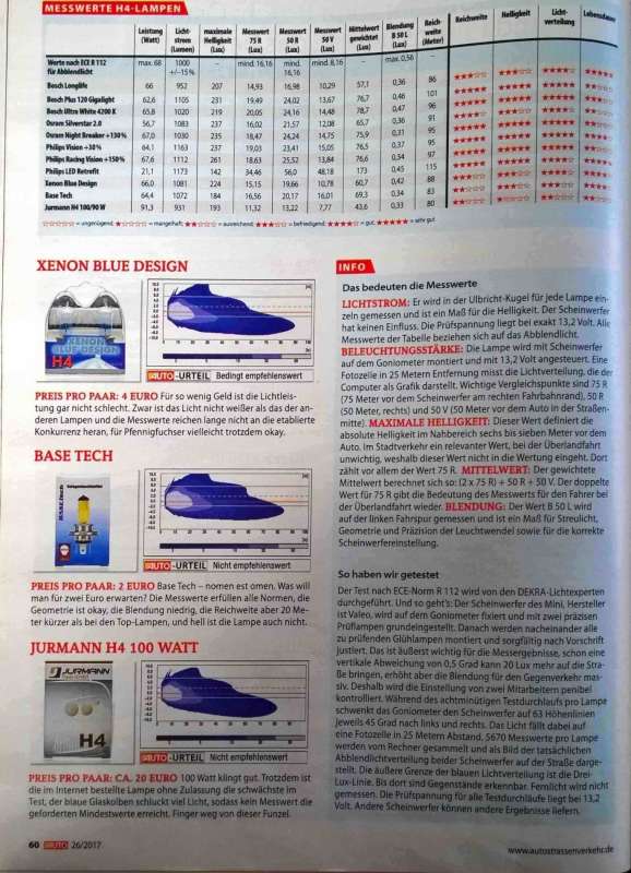 Dostal jsem nemecky casopis s porovnanim zarovek (H4). Pro zajimavost je ve srovnani i 100W zarovka a LEDka.
