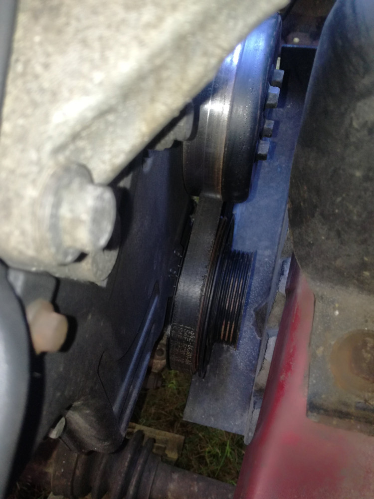 A další věc, co mi vrtá hlavou je, proč na řemenici na klice mám nasazenou ještě druhou řemenici pro druhý řemen, který tam ale neni. Takhle to mám třeba řešený na bmw, že na klice jsou 2 řemenice a ta druhá co je víc vepředu je pro malý řemen jen pro klimu, jenže tady je i ta klima řešená pouze jedním, ale delším řemenem.