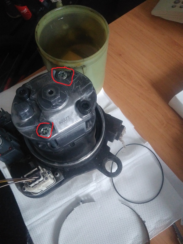 tady foto pro případ zájmu: Jo a koukal jsem a možná to nefunkční nakonec půjde rozebrat. Nádobka drží pomocí spony. A po vylití oleje jsou uvnitř vidět torxy. ŘJ je taky na torxech tak možná půjde taky vytáhnout. Až bude čas zkusím to ze zevědavosti kuchnout. Jelikož když jsem koukal na nové tak chtějí starý jako vratný díl, tak předpokládám, že je k něčemu používají. Bylo by fajn opravit ten původní, jelikož netuším jak dlouho bude žít ten z vrakáče