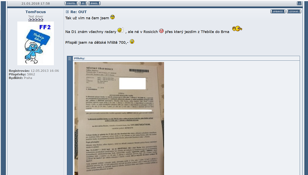No z Rosic a ze Židlochovic už jsem za poslední dva roky také obdržel pozdrav. Přitom to jak v Rosicích tak v Židlochovicích dobře znám a o radarech vím, ale holt jsem se ani nějak nechal unést a jel jsem tam rychleji. Zase díky za Waze, bez něj bych ty odpustky musel platit furt. Ale některé radary, typicky v neobydlených místech za obcí jsou vyloženě prasárna, viz. třeba to co jim před lety někdo krumpáčem rozflákal v Moravských Budějovicích. Ale neřeším to, beru to jako svoji chybu