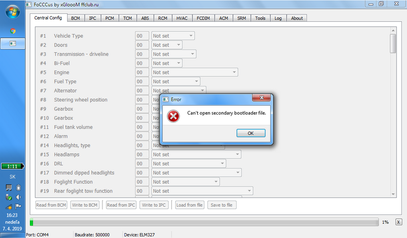 Chci si změnit monitoring tlaku pneumatik z TPMS na DDS. Zapnu zapalování. FoCCCus_0.8.6 se mi přes kabel připojí k vozidlu a načte parametry z BCM. Pro jistotu si je uložím do souboru. To vše jsem udělal a dál se neodvážil.