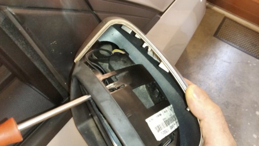 K těm krytkám je přístup škvírou mezi zrcátkem a ráměčkem - škvíru si uděláte co největší, - jednoduše nastavíte zrcátko ovládáním co nejníže, jakobyste chtěli vidět na zadní kolo. Do škvíry se pak přesně vejde 5mm křížový šroubovák, který se zasune do připraveného otvoru mezi západku a držák - a tím se západka stlačí dolů, a držák se uvolní. Nutno provést na obou stranách. Buď dvouma šroubovákama, nebo si jednou rukou ten kryt "předpružit", aby západka neskočila zpět, a uvolnit jednu po druhé.