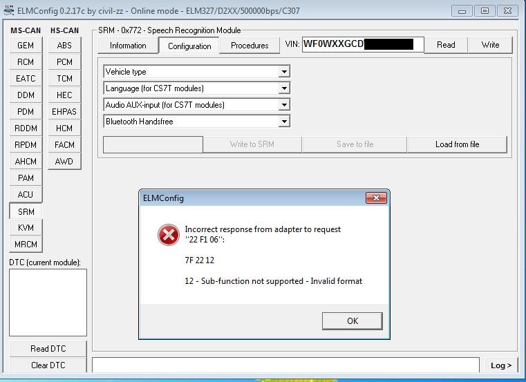 jeste jsem ted byl zkusit jine verze Elmconfigu a ve vsech je to stejny, vyhodi to tuhle hlasku (VIN na screenshotu zustal nacten predtim jiz z GEMu)