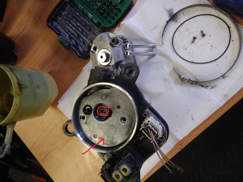 Je třeba větší síla je to dost dotažené. 5. Nyní sundáme ze středu unašeč (spojuje čerpadlo a rotor) a krycí plech ve kterém je černé plastové těsnění (kroužek) tak ten neztratit