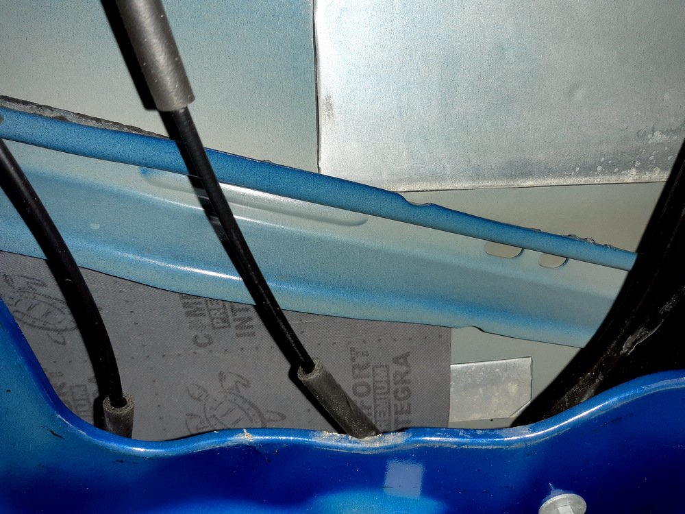Plech dveří zevnitř a membrána - antivibrační materiál. Pečlivě nalepíme membránu a nalepujeme pláty. Vše co je možné je lepší z plechu domontovat nebo vycvaknout a pak to po lepení vrátit zpět..