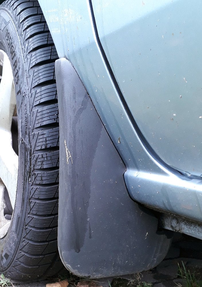 Přistoupil jsem tedy ke "gumové verzi" zástěrek, které jsem upevnil na jeden vhodně situovaný šroub do podběhu (podloženo plastovými podložkami z obou stran, aby si ta guma lépe sedla). Uznávám, že to z pohledu zatékání vody mezi plastový podběh a plechový okraj prahu to stále není dokonalé, ale ten hlavní cíl (aby se nešpinily dveře a nelítaly na ně kamíky) to tak nějak plní. Navíc, ta černá guma není tak pohledově nápadná jako ty bílé plastové plácačky...