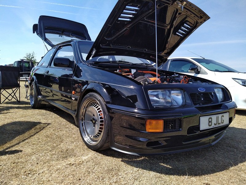Jízdy pokračovaly během celého dne, takže jsme šli dál po okruhu sledovat, co vše ještě můžeme vidět. Za zmínku stojí určitě stánek hlavního sponzora Mountune. Stály se tam velké fronty v turniketech na prodej dílů - a že to tam chvíli vypadalo, jako kdyby ty věci dávali zadarmo. Za menším hloučkem lidí - závodní verze Ford RS200. Jdeme dále - nacházíme místo se stánky s občerstvením a autokosmetikou. Před ním stojí stará hranatá Fiesta - s motorem YB Cosworth a Turbem T04, přestavěnou na zadní náhon. Majitel patrně šílenec. Asi po další půlhodině procházení mezi zajímavými kousky, které byly různě zatoulané - jako třeba pár Focusů RS MK1, které nestály u hlavního dvojřadu. Co jsme tak pochopili, tak jsou určité zóny, kde jsou určitá auta pospolu a pak ještě zóny, kde jsou kluby. Takže proto se kolikrát objevily auta různě rozházená. Ale bylo to svým způsobem takové pestřejší a vlastně dopředu nikdo nevěděl, co tam bude stát. Po chvíli vidím první Sierru RS Cosworth v bílé barvě a 3dveř s ploutví. Není to RS500, ale první civilní třídveř. Vedle něj Saphire RS Cosworth. Oba kousky přepečlivě umyty a naleštěny. Kousek od těchto krásných kousků procházíme místem, kde byla burza s díly, stánky s různým oblečením, nálepkami, kosmetikou, díly, modely autíček až po občerstvení. Na chvíli odběhnul Mates - ikdyž tam nebylo tak přelidněno jak jsem čekal, během pár vteřin byl pryč. Za chvíli se objevil, drapnul mě a že se asi poseru! - No skoro ano, Ford Capri, ale překopaný dobovým týmem DRM (předchůdci DTM) Zakspeed. Takže na place stál Ford Capri Zakspeed Turbo. Upřímně bych tohle čekal spíše mimo Anglii, ale tohle mě dostalo! Byly dvě varianty motorů - 1,4 Turbo 480koní 9200 ot/min a 1,7 Turbo něco přes 600koní a stejně točící se nesmysl...Přiznám se, že nevím která jednotka v tom byla, ale bylo to šílené, vidět to na vlastní oči a z blízka. Auto z trubek o váze kolem 800kg s takovým výkonem. Masivní bodykit a pod dlouhou kapotou malý brutální mixér, který ve své době neměl konkurenci. Takže zase zpět nohama na zem a jde se dál. O kousek dál nám zase předvedli angličani zlaté ruce a lidovou tvořivost. Focus RS MK2 Cabriolet... To už se po sobě díváme, jestli nemáme úpal, ale tam to asi krom nás 4 nikoho ze židle nezvedalo. Pomalu jsme dostávali hlad, takže jsme se odebrali směrem ke stánku. Po cestě nacházím první Sierru RS500 Cosworth v originál verzi, ale místo T04 bylo turbo Borg Warner. Přicházíme ke stánkům na anglický cheesburger, který byl snad asi nejlepší, jaký jsem kdy jedl, až na uřvanou prodávající, která byla jako papoušek a v okruhu stánků jsme slyšeli jen ji a její " Next please! " . Nicméně sedímena u stolu a díváme se na Mustang Shelby GT500 Eleanor...Po jídle jsme pokračovali v procházce dále. Na jednom place bylo asi 20kousků Fiesty ST200 v šedé barvě. Po cestě vidíme palouk, kde z dálky září oranžová asi 80ks ST Focusů MK2 a MK3, nacházíme Escorty, Mondea, Escorty ve verzi kurýr, Sierru pickup. Mondea ST220....bylo toho tolik, že se to nedalo ani všechno zapamatovat a fotit.