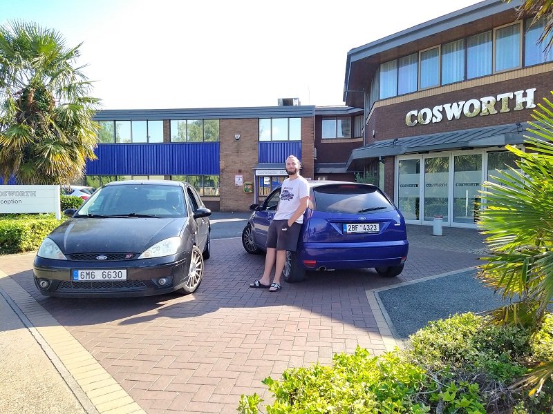 Sobota ráno - vyrážíme dle výše uvedeného seznamu na místa. Všechna dodnes fungují - kromě posledního - Andyho hala už má dávno jiného majitele a závodní vozy už se tu nějakou dobu nestaví. Když jsme přijížděli do Northamptonu k sídlu Cosworth, zaparkovali si to kluci přímo před hlavní vchod jako kdyby nám to tam patřilo. Nasměrovaly se auta a že uděláme vzpomínkovou fotku. Vždyť oba motory se přesně po 20-ti letech zase podívaly na místo činu. Byli jsme tak zaneprázdnění focením, že nám nedošlo, že jsme na cizím pozemku. Po chvíli vyšel vrátný - tak jsem mu šel naproti, abych mu řekl, že si chceme jen udělat pár fotek a hned zmizíme. No paradoxně jsem tu jedoducho uvětu trochu zamotal, tak jsem si česky odprskl " ty vole, tak ještě jednou " a vrátný se na mě podíval a pronesl: " Já rozumiem po česky, já som zo Slovenska " Tak ten mě docela uzemnil