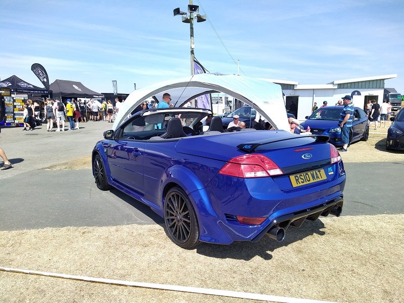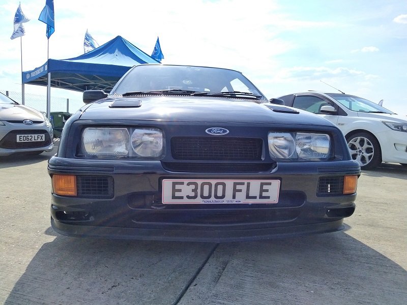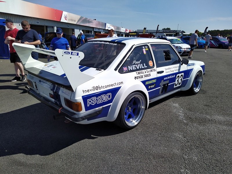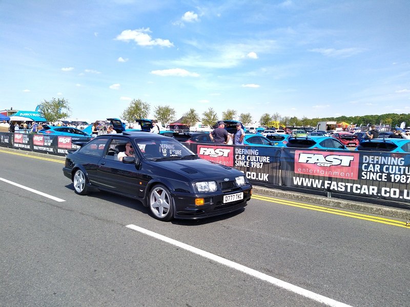 Jízdy pokračovaly během celého dne, takže jsme šli dál po okruhu sledovat, co vše ještě můžeme vidět. Za zmínku stojí určitě stánek hlavního sponzora Mountune. Stály se tam velké fronty v turniketech na prodej dílů - a že to tam chvíli vypadalo, jako kdyby ty věci dávali zadarmo. Za menším hloučkem lidí - závodní verze Ford RS200. Jdeme dále - nacházíme místo se stánky s občerstvením a autokosmetikou. Před ním stojí stará hranatá Fiesta - s motorem YB Cosworth a Turbem T04, přestavěnou na zadní náhon. Majitel patrně šílenec. Asi po další půlhodině procházení mezi zajímavými kousky, které byly různě zatoulané - jako třeba pár Focusů RS MK1, které nestály u hlavního dvojřadu. Co jsme tak pochopili, tak jsou určité zóny, kde jsou určitá auta pospolu a pak ještě zóny, kde jsou kluby. Takže proto se kolikrát objevily auta různě rozházená. Ale bylo to svým způsobem takové pestřejší a vlastně dopředu nikdo nevěděl, co tam bude stát. Po chvíli vidím první Sierru RS Cosworth v bílé barvě a 3dveř s ploutví. Není to RS500, ale první civilní třídveř. Vedle něj Saphire RS Cosworth. Oba kousky přepečlivě umyty a naleštěny. Kousek od těchto krásných kousků procházíme místem, kde byla burza s díly, stánky s různým oblečením, nálepkami, kosmetikou, díly, modely autíček až po občerstvení. Na chvíli odběhnul Mates - ikdyž tam nebylo tak přelidněno jak jsem čekal, během pár vteřin byl pryč. Za chvíli se objevil, drapnul mě a že se asi poseru! - No skoro ano, Ford Capri, ale překopaný dobovým týmem DRM (předchůdci DTM) Zakspeed. Takže na place stál Ford Capri Zakspeed Turbo. Upřímně bych tohle čekal spíše mimo Anglii, ale tohle mě dostalo! Byly dvě varianty motorů - 1,4 Turbo 480koní 9200 ot/min a 1,7 Turbo něco přes 600koní a stejně točící se nesmysl...Přiznám se, že nevím která jednotka v tom byla, ale bylo to šílené, vidět to na vlastní oči a z blízka. Auto z trubek o váze kolem 800kg s takovým výkonem. Masivní bodykit a pod dlouhou kapotou malý brutální mixér, který ve své době neměl konkurenci. Takže zase zpět nohama na zem a jde se dál. O kousek dál nám zase předvedli angličani zlaté ruce a lidovou tvořivost. Focus RS MK2 Cabriolet... To už se po sobě díváme, jestli nemáme úpal, ale tam to asi krom nás 4 nikoho ze židle nezvedalo. Pomalu jsme dostávali hlad, takže jsme se odebrali směrem ke stánku. Po cestě nacházím první Sierru RS500 Cosworth v originál verzi, ale místo T04 bylo turbo Borg Warner. Přicházíme ke stánkům na anglický cheesburger, který byl snad asi nejlepší, jaký jsem kdy jedl, až na uřvanou prodávající, která byla jako papoušek a v okruhu stánků jsme slyšeli jen ji a její " Next please! " . Nicméně sedímena u stolu a díváme se na Mustang Shelby GT500 Eleanor...Po jídle jsme pokračovali v procházce dále. Na jednom place bylo asi 20kousků Fiesty ST200 v šedé barvě. Po cestě vidíme palouk, kde z dálky září oranžová asi 80ks ST Focusů MK2 a MK3, nacházíme Escorty, Mondea, Escorty ve verzi kurýr, Sierru pickup. Mondea ST220....bylo toho tolik, že se to nedalo ani všechno zapamatovat a fotit.