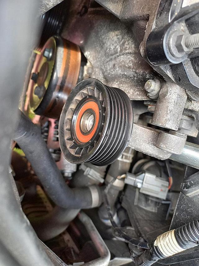 Řemen klimatizace byl podstatně horší, jelikož přípravek na to nemám, ale taky jsem to nakonec přepral. Co mě překvapilo, je uložení řemenice kladky, kterou jsem také měnil. Čep, na kterém je nasazena, sahá pouze cca do poloviny šířky ložiska, pak je to stáhnuté už šroubem. Zvláštní, tohle jsem zatím nikdy ještě neviděl: