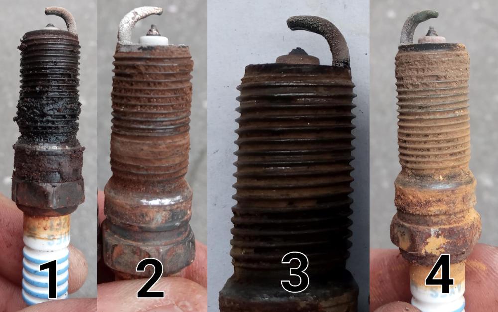 Nejvíc zdevastovaná elektroda na 3. svíčce, ale i ty zbylé vykazovaly "jisté známky opotřebeni" (mezery postupně 1.95, 1.5, 2.1, 1.5 mm).