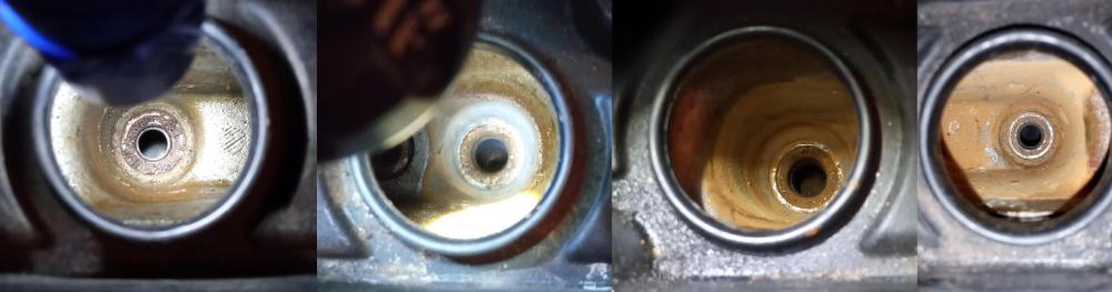 2) Kde se vzal olej v závitu svíčky 1, když nahoře kolem těla svíčky, co čouhá ven, žádný zjevný olej není.