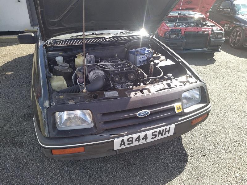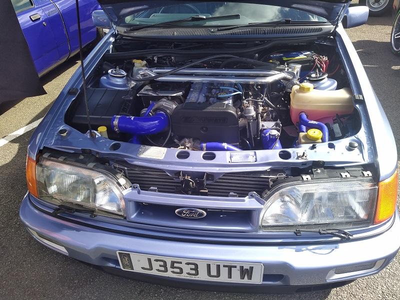 Chtělo se to vrátit nohama trošku zase na zem a myšlenkama zpátky do reality, jenže ono to vlastně moc ani nešlo. Ikdyž tam stojí něco v původním stavu a na oko to není žádná sporotvní verze, u nás to člověk s největší pravděpodobností neuvidí, a pokud ano, tak rozhodně ne v takovém stavu. Krásným příkladem dva vedle sebe stojící Escorty MK3 veverzi Courier, dvě krásné sériové Fiesty MK2, dvě naprosto krásné Anglie, nebo v řadě stojící 4 nádherné Fordy Capri. Chvíli jsme zase nevěděli, kam se dívat dřív, bylo tam toho tolik, že se to dalo těžko vstřebávat. Vedle stojících Capri stál z venku nádherný Ford Escort RS Cosworth - na první pohled sériový - tento moment dlouho nevydržel, když jsem viděl jak velké měl turbo, nezbývalo nic jiného, než nad tím zakroutit hlavou...Sotva tohle člověk rozdýchá, naproti stojí Escort MK1 kostička ve verzi kupé-kombi...Samo o sobě je tato verze velice vzácná, ale majitel zřejmě taky dobrodruh - motor Cosworth YB a auto na 13-ti palcových kolech s nízkoprofilovými pneumatikami. Jestli toho blouznění na slunci nebylo do té doby málo, tak kousek od těchto aut stály v řadě 4 Sierry ve verzi pickup....Dvě s pohonnou jednotkou V6 a dvě s jednotkou Cosworth YB...Už se začala pomalu dostavovat agónie z toho všeho kolem, ale ten hlavní " úpal " teprve přišel. Vrátím se nyní ke zmíněné Sieře, která byla na trati - ano, ten kombík na 17" plechových kolech, který střílel za každým kvaltem a udolal okruhový Escort RS Cosworth...Otevřená kapota mě vyloženě lákala, abych tam strčil hlavu a zjistil, co za peklo se tam schovává. Nijak zvláštní překvapení se nekonalo, protože už z jízdy na trati podle zvuku a projevu jsem věděl, že to bude určitě YB od Cosworthu, a samozřejmě, že bylo. Vedle motoru velké turbodmychadlo BorgWarner...Na bočním okýnku za řidičem byl na papíru celý rozpis úprav auta. Pokusím se fotku nahrát, protože to bylo hodně zajímavé čtení. Každopádně Sierra měla 651 koní , 525 Nm kroutící moment, sekvenční převodovku a mnoho dalších věcí. :irre: Rovnou mohu prohlásit, že mě to počtení docela odrovnalo a už jsem se nezmohl ani na to, kroutit nad tím hlavou - obvzlášť, když jsem viděl ty plechové disky, auto, ve kterém nebyl ani rám a korunou tomu všemu byl volant - obyčejný sériový volant z prvních modelů Sierry - takový ten, co má trojúhelníkový střed a jen dvě ramínka dole...V tu chvíli jsem přestal na chvíli mluvit a šel kam mě nohy nesly...