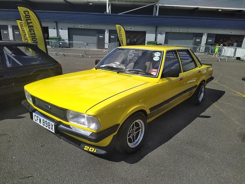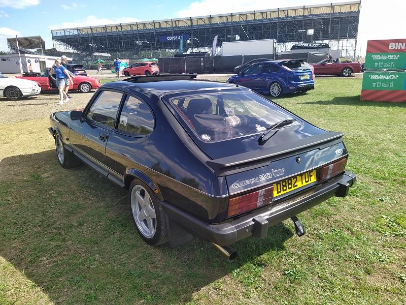 Už kousek od naší plochy, jsme viděli obrovské množství Fiest různých generací - je pravdou že ST180 je opravdu ve velkém počtu v anglii pořádně oblíbená a sekunduje jí její nástupkyně ST200. Samozřejmostí byly Focusy ST225 - také ve velkém počtu. Obecně, letos to byl ročník, kdy největší zastoupení co se počtu modelu týče, byla právě Fiesta. Procházíme kolem další tribuny a vystavované plochy. Hned z dálky do očí bijící - Escort RS Cosworth WRC tovární homologační speciál se "čtyřokem" na kapotě...Hned nám padla brada na začátek...o kus dál stojí první Ford Capri s krásným řadovým šestiválcem, vedle něj Cortiny poslední generace. Nevěděli jsme, kam dřív s očima - protože za auty byl plot a za ním dráha, takže chvíli jsme obdivovali stav a stáří aut a najednou hlavy nahoru a dívat se na ty zběsilosti na dráze...