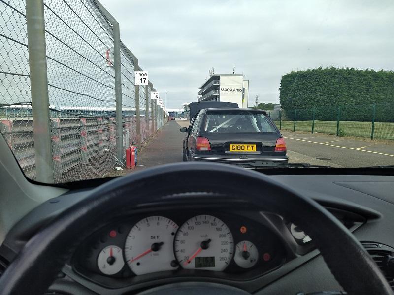 Bylo dost času, protože jízdy jsme měli koupené v časech 9:40 a 10:00, briefingy jsou vždy hodinu před jízdou, tak jsme šli pomalu projít areál, aby jsme věděli kudy kam se dá jít. Tím, že jsme letos stáli na jiném místě se to trochu komplikovalo s chůzí, protože jsme byli za jednou z tribun u trati a měli tak na výběr jen dvě cesty kudy jít směrem ke všemu, a to buď z jedné strany kolem trati a následně přes most nad ní, nebo z druhé strany tunelem pod ní. Vzdáleně to bylo tedy trochu dál, ale rozhodně to na celé atmosféře nebylo nic, co by se nedalo zvládnout, nebo by to samotnou atmosféru mělo nějak zkazit. Vyrazili jsme pomalu směrem k depům, abychom mohli podepsat papíry o odpovědnosti, aby jsme mohli později na trať. Nezdálo se to, ale cesta od pluska k depům trvala skoro 15 minut,což by nevadilo, jenže briefing jsem měl v 8:40-9:00 a 9:40 už jsem měl kroužit po Silverstoneu. Briefing skončil na minutu přesně, před místností jsme se u dep ještě pobavili s bráchou jak to provedeme, protože on měl jízdu hned po mě, takže to znamenalo, že helmu s rukavicemi jsem mu musel dát ještě před svojí jízdou, aby byl následně připravený, že jen co dojedu jízdu, hned se vrátím na nájezd u Medical Centra, předám mu plusko a rovnou vyrazí na trať. Plán byl jasný, já spěchal co mi nohy stačily k autu - u něj jsem byl zhruba 9:15 - jenže mě čekalo projetí areálem, kde stále ještě najížděly auta dovnitř, takže jsem neměl úplně volnou cestu a hlavní myšlenka byla, aby se stihl ohřát olej a dojel jsem tam včas. Nakonec jsem tam byl zhruba kolem 9:30 což bylo fajn a byl čas nechat plusko bublat a jít okouknout, co se mnou pojede v jízdě. Hned první co stálo přede mnou byla stará hranatá fiesta - úplně mi to vybudilo vzpomínky, kdy nás přesně tento typ na rovince ve 190 km/h doslova přeletěl, tak jsem se ze zvedavosti šel podívat, co tam má za motor, protože ta kastle byla tak odlehčená, že se na volnoběh skoro celá vlnila. Už jen když jsem viděl místo půl předku gril, tak jsem tušil, že to bude zase něco extra, no velké překvapení se nekonalo - motor ST170 ALDA...Moment! - Turbo...Majitele jsem se v rychlosti zeptal na výkon - "Přesně to teď nevíme, ale něco přes 400 koní..." 8O