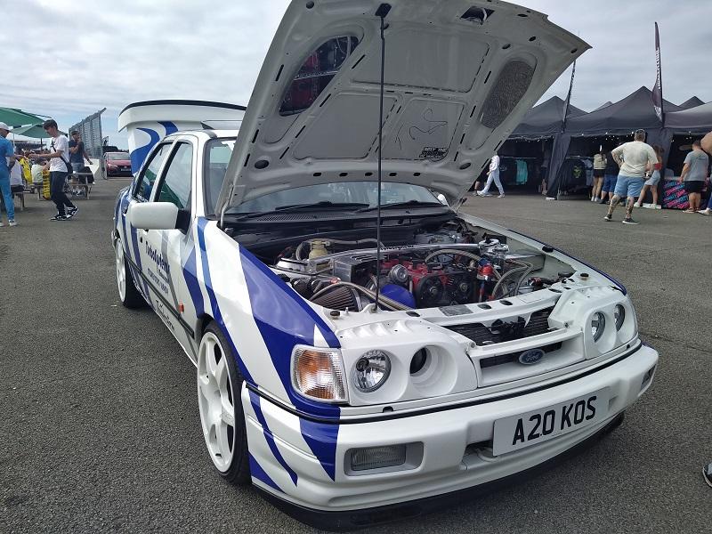 Už kousek od naší plochy, jsme viděli obrovské množství Fiest různých generací - je pravdou že ST180 je opravdu ve velkém počtu v anglii pořádně oblíbená a sekunduje jí její nástupkyně ST200. Samozřejmostí byly Focusy ST225 - také ve velkém počtu. Obecně, letos to byl ročník, kdy největší zastoupení co se počtu modelu týče, byla právě Fiesta. Procházíme kolem další tribuny a vystavované plochy. Hned z dálky do očí bijící - Escort RS Cosworth WRC tovární homologační speciál se "čtyřokem" na kapotě...Hned nám padla brada na začátek...o kus dál stojí první Ford Capri s krásným řadovým šestiválcem, vedle něj Cortiny poslední generace. Nevěděli jsme, kam dřív s očima - protože za auty byl plot a za ním dráha, takže chvíli jsme obdivovali stav a stáří aut a najednou hlavy nahoru a dívat se na ty zběsilosti na dráze...