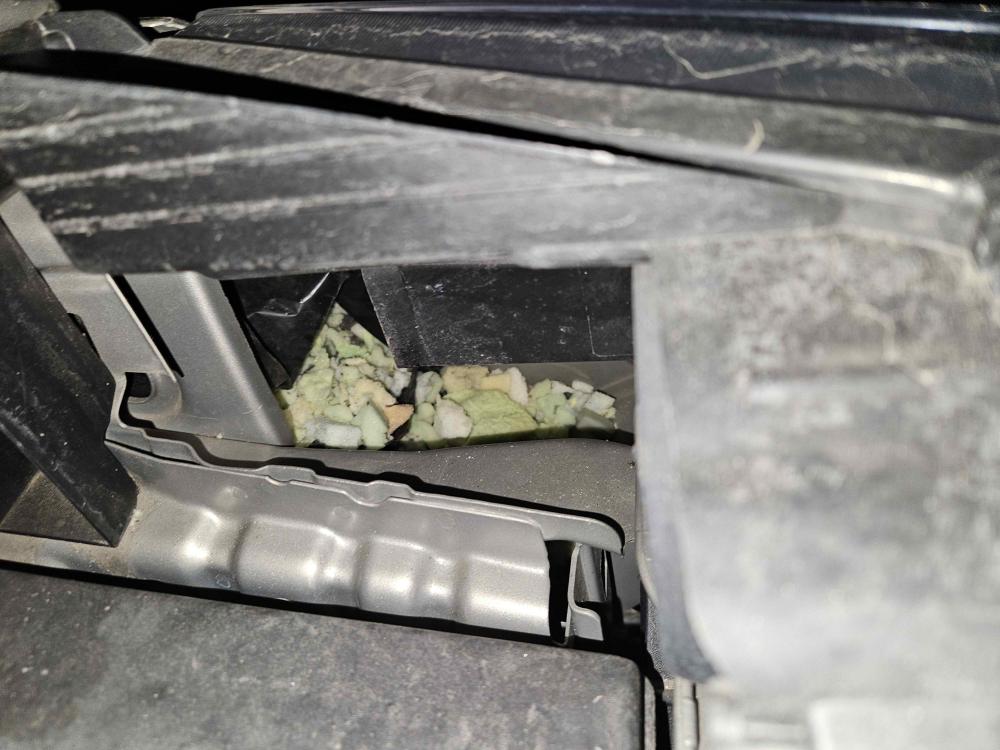 Našel jsem v motorovém prostoru nad levým blatníkem rozkousaný molitan - viz. foto.