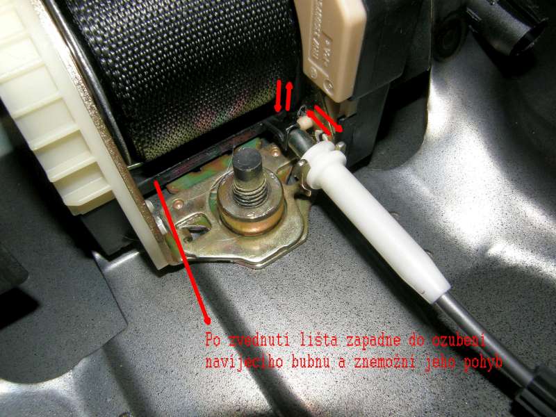 (u FoFo II uz neni bowden, ale ocelova kulicka primo v navijeci, ktera svoji vahou podle polohy sedacky zablokovava nebo povoluje odvijeni pasu)