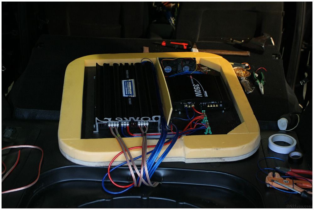 Ahoj, dlouho jsem přemýšlel, kam dát zesilovače tak, aby nesebraly žádné místo a celkově se neomezila funkčnost kufru. Nakonec jsem vymyslel a zrealizoval toto řešení (viz odkaz + obrázek).