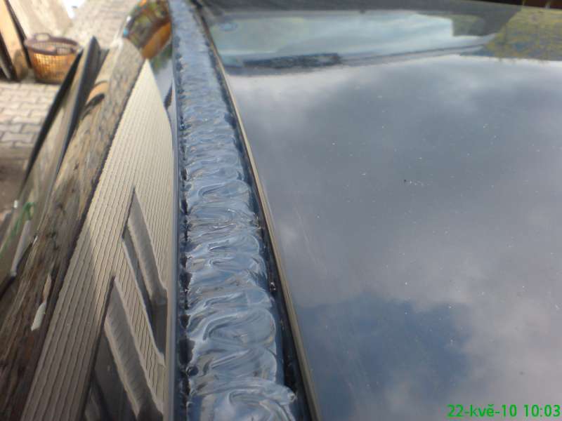 Po oddělání lišt jsem nenašel žádný spoj a žádnou prasklinu. Střešní žlábek pro lištu hladký bez nerovností. Při zpětné montáži jsem trochu mázl Butymelem gumové těsnění co je okolo šroubů.