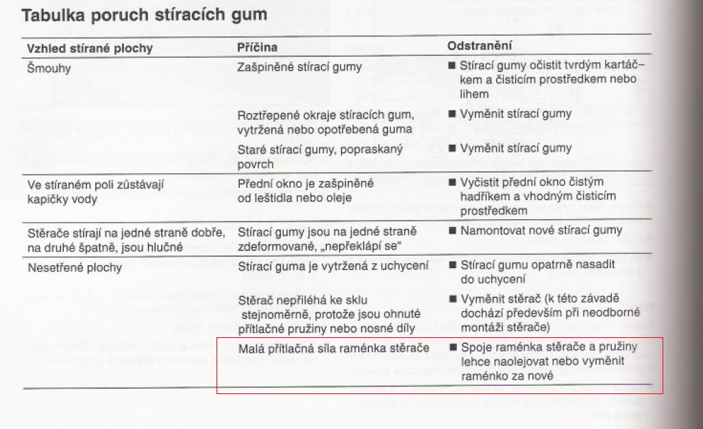 . Vyjedu z garáže, stěrače stírají dobře a cca po 10 km po dálnici prostředek stěrače asi v tomto počasí namrzne a stírájí tak max 2/3 celé délky. Samozřejmě před řidičem je ta oblast, kde nestírají