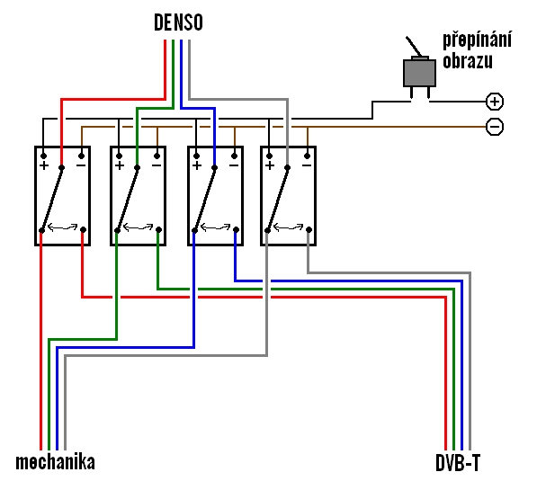 Pak jsou dvě možnosti, buď to můžeme přepínat vypínačem kterej si někde vyvedeme a nebo to napojíme ještě na přehrávač tak aby při jeho zapnutí šlo napětí i do relátek a tím pádem by se samy přeply. Po vypnutí přehrávače přestane jít napětí i do relátek a tak se zase přepnou zpět na původní zobrazení densa.