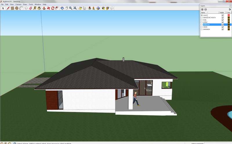 Dal jsem na Vas a komin uz neni v detskem pokoji. Uprostred vznikla technicka mistnost a pradelna zaroven. Druhy detsky pokoj vznikl misto puvodni pradelny. Domek se jeste o kousek zvetsil a rovnou strechu jsem vymenil za valbovou (tim vznikl i fajn koutek na drevo). Zahrada je zatim provizorni - pouze trava a bazen jeste neni umisteny