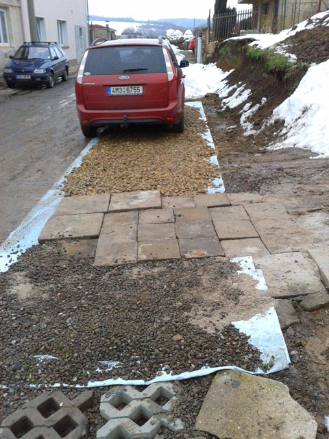 Tak včera hotovo. Samo domo a sám. Ráno jsem koupil geotextilii 200g, 2m šíře, 1bm á 31,- (nic jiného stejně neměli) Geotextilie přesahuje cca 20cm přes asfalt a doufám, že to ty 2 měsíce vydrží. Dělal jsem to na funkčnost a ne na pohled :D S vozíkem jsem ještě musel na STK a pak si to kamení dovezl sám.