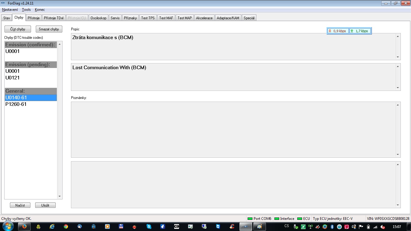 hoj, mám problém na FF 1.6 benzín rv. 2008, na displeji se rozsvítí cca po 1 km chyba Engine Malfunction, rozsvítí se polovina palubní desky, spadnou rafičky na 0 a auto jede v nouzáku, screen z diagnostiky (ForDiag) níže, poradíte kde hledat závadu? díky moc!